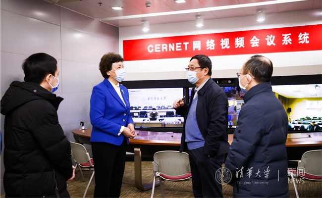 随后,陈旭来到位于法律图书馆地下一层的教学指挥中心。大屏幕上,实时滚动着正在进行线上教学的课堂情况。陈旭对线上如期开课第一日教学平稳有序、师生精神饱满表示肯定,对老师们富有创造力和展现力的课堂教学表示称赞,期待清华师生以高质量的在线教学交出一份经得起历史检验的答卷。