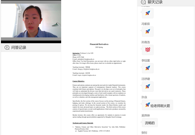 2月19日下午两点,清华五道口助理教授安砾老师准时上线了,她点开紫荆教育平台的直播,开始了本学期“金融衍生工具”的第一课,同时在线的还有两班合并上课的140多位同学。