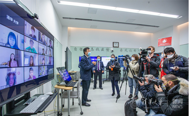 在位于清华法律图书馆地下一层的教学指挥中心,室内环绕的大屏幕实时滚动播放着当天课程的各项数据和教学动态。杨斌、彭刚向记者们介绍了学校全面在线开课的总体情况和特色做法,分享了学校和师生为保障在线教学顺利进行的动人故事。学堂在线首席运营官、“雨课堂”技术负责人王帅国展示了在线教学平台,记者们现场连线了正在讲授本科生专业课“交互设计”的美术学院教师付志勇,并与师生们“面对面”互动交流。