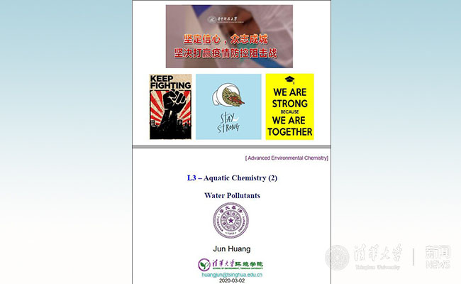 课程第一张PPT,黄俊展示了华中科技大学抗击疫情的海报,一下子拉近了清华与华中大师生的心理距离。旁听课程的华中科技大学陈静老师课后专门留言说:“请允许我在群里表达一下我的感动,这是清华环境学院黄俊老师的PPT。我们今天开始第一节课,PPT的第一页就令我非常地震撼和暖心”。