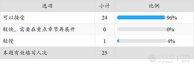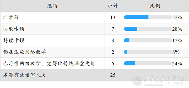 疫情期间,我们在开学后第一周和第二周增加了调研,其目的在于调研学生对于在线学习的看法、困难,家里网络信号的程度等,调研后在第二周教学时结合第一周的调研结果,我们有针对性地对课程设计和要求进行了调整。譬如,第一次调研反馈,学生们反映信号不好,雨课堂来不及答题就进入下一环节了,另外,有些学生反映如果开视频,几乎就无法听课了,声音断断续续。所以,第二次上课时,我们的雨课堂提问就延长了答题时间,同时,腾讯应用时,没有要求学生一定要开视频。这里,我们展示第一周调研的部分数据结果如下: