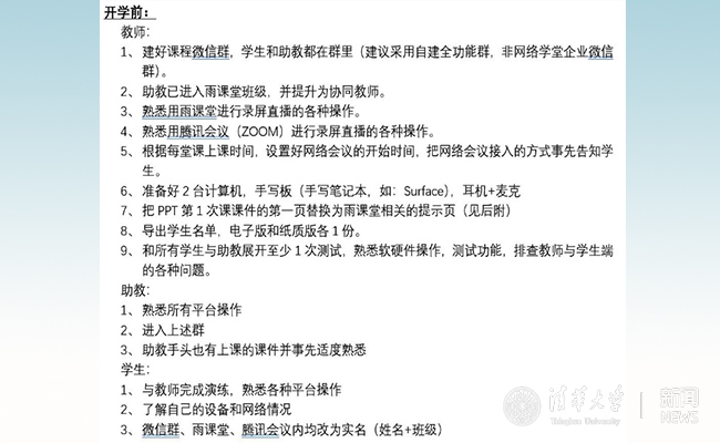 在线教学对大多数老师和同学来说都是新鲜事物,在刚开始时,一定要充分考虑,做好各项预案与测试工作,以免正式授课中浪费过多时间处理非教学内容。例如:经过和在线教学专家组的老师们多次商议与讨论,我们列出“开课前的Checklist”与“每次上课前的Checklist”,并做好了应对各类突发状况的预案。内容如下: