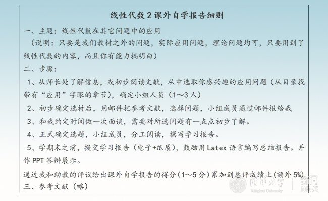 总评成绩=平时作业20% + 课堂表现&随机小测20%+ 期末考(闭卷)60%+课外扩展自学报告5% (额外分)。该评价体系从各个层面激发了学生的学术志趣,锻炼了学生的动手能力与创新能力。此外,我们还在配套习题、习题课安排与作业评价方面进行以下过程激励的改革与尝试。“拓展性课外报告”的引入,激发了学有余力的学生的探究精神。