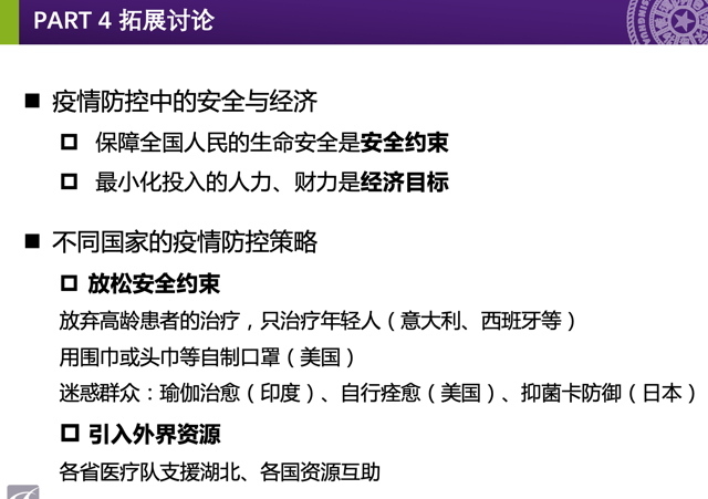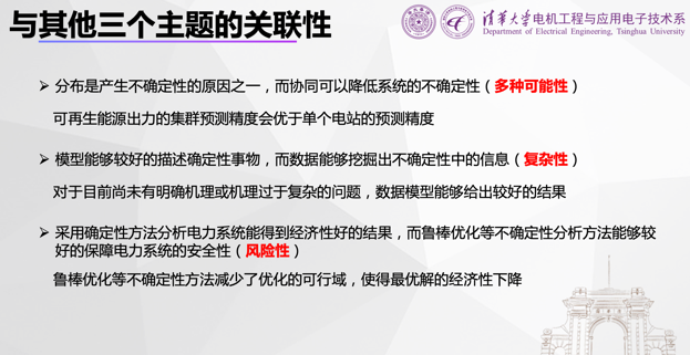 目前,国内国际的疫情发展牵动着每个人的心,而课程主体是思维最为活跃的清华青年学子,因此教师在课程教学中结合相关内容引导学生对这一社会热点进行深入思考,激发大家的社会责任感,让课程思政如盐入水,润物无声。在设计课程讨论主题时,向大家提出了“额外要求”:做跨界思考,我们所讨论的四个技术路线——“确定与随机”“安全与经济”“分布与协同”“模型与数据”——在抗击与防范疫情方面,是否有成功的或者潜在的应用?与电力系统的运行控制有哪些可相互借鉴提高的地方?鼓励同学们也对这些问题进行了深入的、独立的思考。