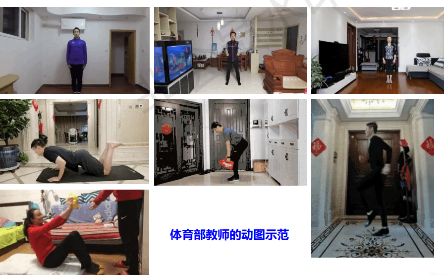 在头脑风暴共同研讨在线体育教学的氛围下,老师们创意迭出。在周放老师的“云课堂”上,负重练习时,大米白面、灌满水的洗衣液瓶子、桌椅板凳等等,皆能成为同学们训练的“利器”。