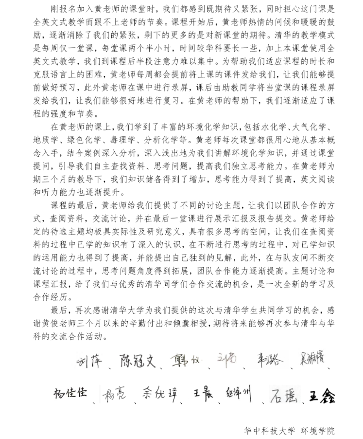 疫情期间,黄俊着力打造雨课堂“克隆班”,为乐竞官方端网站登录入口与华中科技大学的同学们全英文教授“高等环境化学(Advanced Environmental Chemistry)”。正式开课前,黄俊悉心准备了五次试讲排练,以华中科技大学抗击疫情的海报为课程开端,用心研究、反复打磨教学计划,只为呈现出最佳的教学效果,将温暖和力量传递给每一位在线上翘首期盼的学生。千里共上一堂课,师生们在疫情的阴霾中共同燃起一束光亮。课程结束时,黄俊收到了一封来自华中大学子的联名信。“感谢黄俊老师三个月以来的辛勤付出和倾囊相授,”华中大学子纷纷表示,“我们都获益匪浅”。
