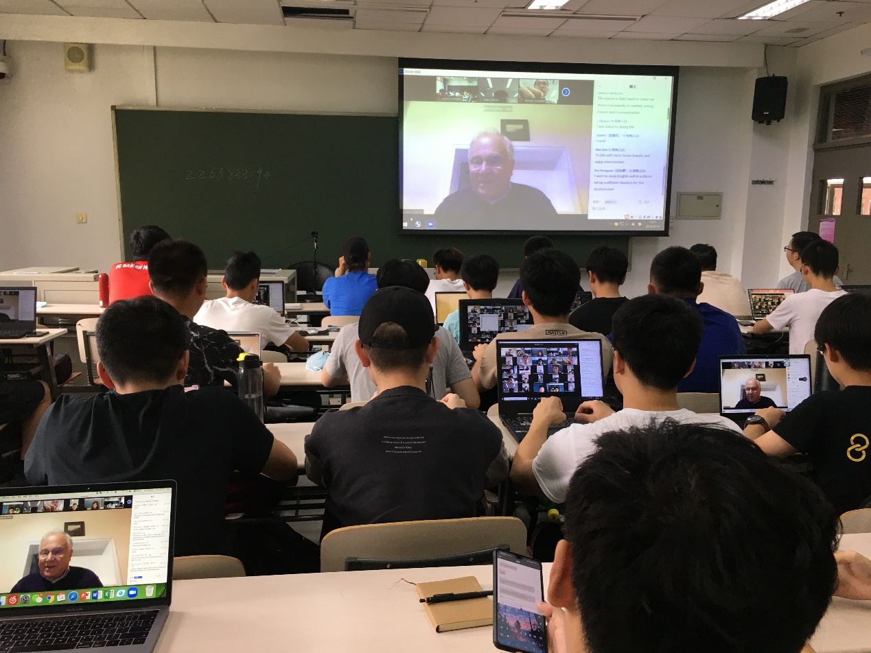 距离无法阻挡师生们的教学与学习热情。虽然身处英国,语言教学中心的外籍教师Olbrich John Francis Andrew克服时差的困难,坚持为同学们在线授课“英语听说交流B”。课堂现场和技术调试由助教维护,确保了跨越大洋彼岸的课程圆满进行。