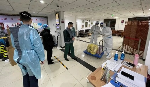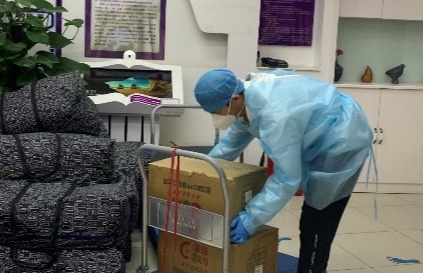 朱士才在C楼总台值班室运送物资