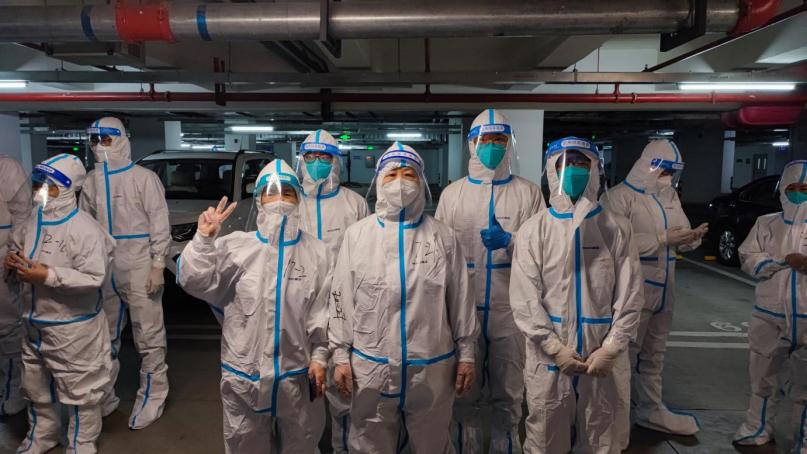 地学系研究生骨干任浙豪(右二)承担宿舍楼突发疫情志愿服务工作