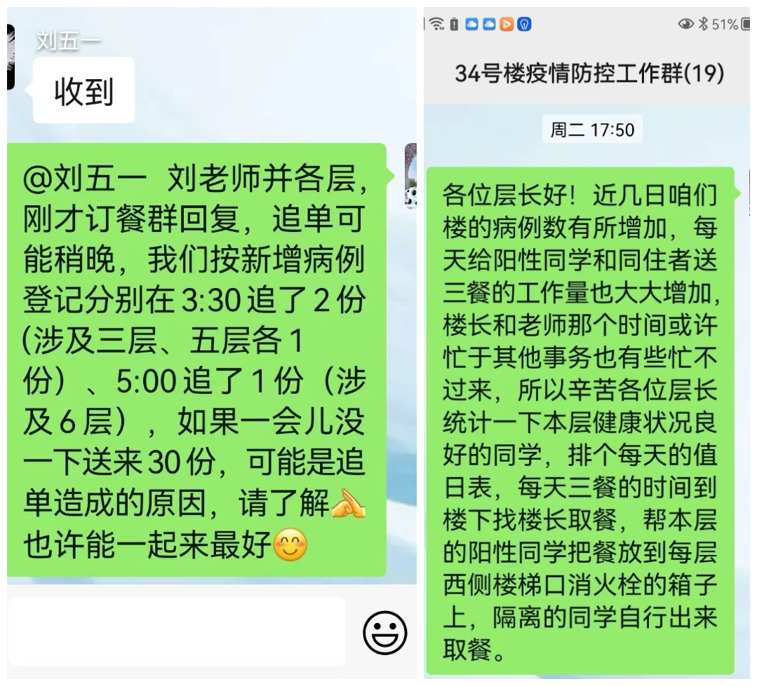 刘敏还在病毒感染后的恢复期,但仍然申请了承担第一周的线上志愿服务,与线下的刘五一配合,共同负责应急状态下面向楼内学生的信息发布,收集阳性同学订餐信息,组织楼内辅导员、骨干、志愿者队伍参与自助服务等。