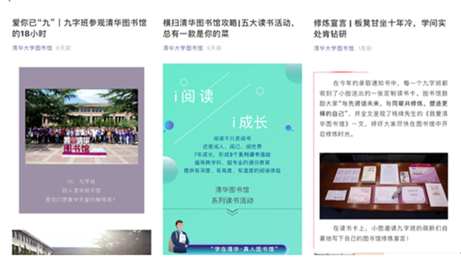 横扫清华图书馆攻略系列则是满满干货,比如“你知道清华到底有多少个图书馆吗?”“参观完图书馆,你借书了吗?”“细数图书馆主页的常用功能”“你必须知道的电子资源TOP10”“校图书馆特色空间一览”“五大读书活动,总有一款是你的菜”,将图书馆的馆舍、资源及服务全面细致地推送给新读者,希望帮助新读者尽快熟悉图书馆、使用图书馆。