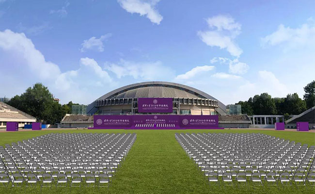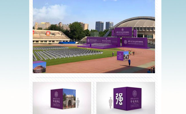 以庄重感和仪式感为基调,典礼主看台和东西两侧的“清华立方印”,以及整齐摆放的白色椅子将东大操场布置一新。