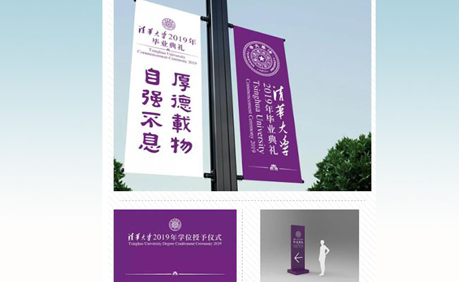 学位授予仪式室内背板,校园道旗、指示路牌......统一的“清华紫”配色一目了然,既是呈现特色鲜明的校园景观,也为让亲友一目了然。