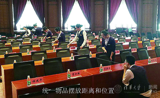 专业化的服务始于细节、人性化的服务要求细节。要想做好会议服务,就需要将琐碎的、繁杂的重复性事务工作加以锤炼,从细节处见真功、从主动处见温度。为了客人取拿方便,工作人员会将茶杯杯把呈45度角摆放于桌子右上方;为了即保证会议效果和人数要求同时方便客人进出,布场时会规划行列间距、用工具标定位置……这些都源自于平时的经验积累和用心观察,并且通过培训将其转化为可执行的标准规范。