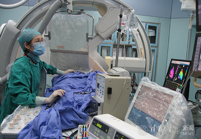 李小梅穿着厚重的铅衣,在X射线下为心律失常患儿做射频消融手术
