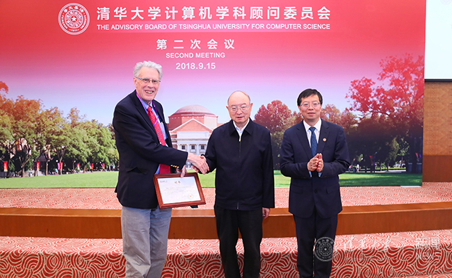 邱勇致辞结束后,陈元和邱勇共同为图灵奖获得者约翰·郝普克若夫(John E. Hopcroft)、图灵奖获得者约瑟夫·斯发基斯(Joseph Sifakis)等七名委员颁发了聘书。
