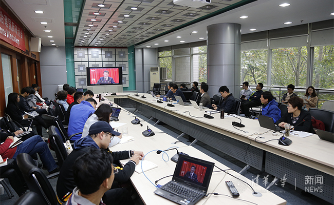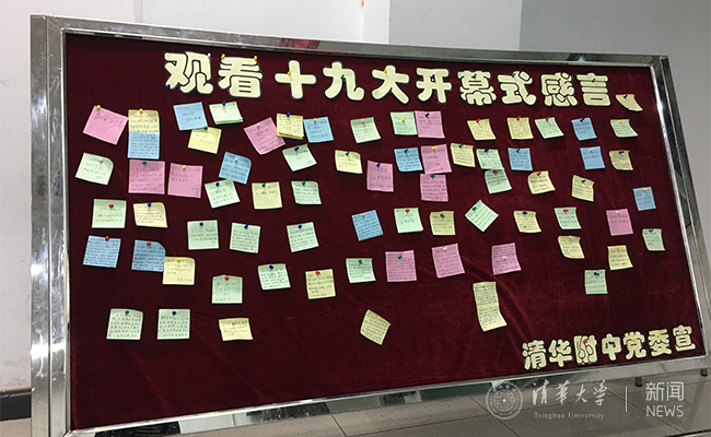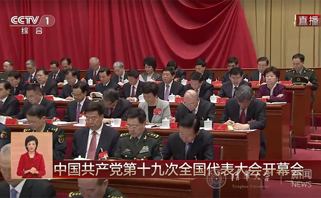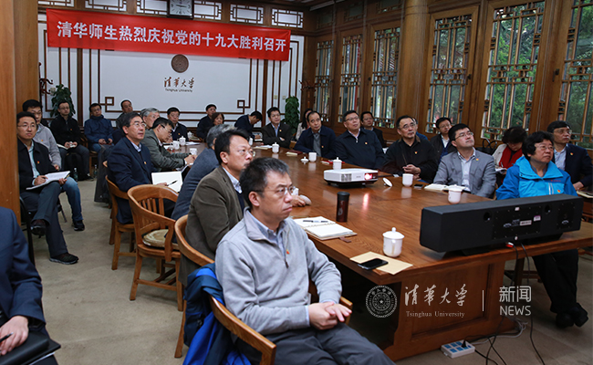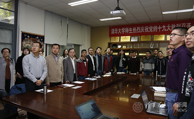 在清华园内,上午9:00不到,师生们早早聚集到各会议室、办公室和实验室,围坐在屏幕前收看开幕会盛况。在工字厅东厅,“清华师生热烈庆祝党的十九大胜利召开”的横幅分外鲜明,校党委理论中心组成员与学校老领导、教师代表们共同收看十九大开幕会直播。在总书记三个半小时的报告过程中,收看现场不时自发响起热烈的掌声。