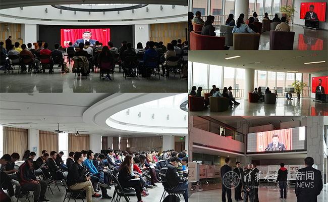 公管学院组织师生分多个场地观看开幕会直播。 记者 张 宇 摄