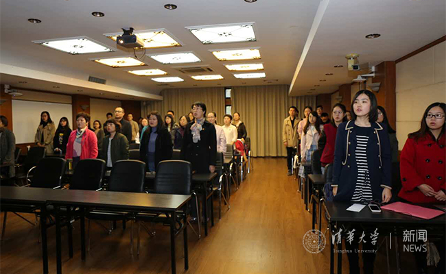 师生在校团委会议室齐唱国歌。记者 张 宇 摄