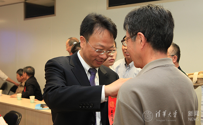 王希勤为毕业50年的校友佩戴纪念章。