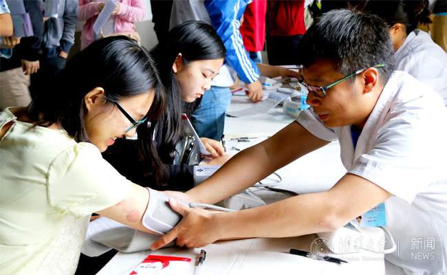 大夫为准备献血的学生测量血压。程 玺 摄