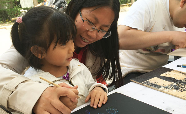 第二部分为互动体验区,现场有纸粘土工艺制作、版画雕刻体验、刮画创作体验,橡皮章雕刻体验,热缩片制作体验等各种互动环节,现场十分热闹,参与度极高。