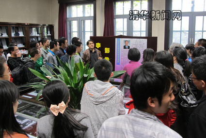 李政道先生捐赠的联系人、图书馆两届“读者之星”获得者、清华物理系教授楼宇庆为本次展览作解说。楼宇庆为读者介绍了许多照片背后鲜为人知的故事,例如1974年李政道先生向毛泽东主席建议,在中国科技大学开设少年班,建议被采纳;李先生自1981年起发起实施中美物理联合考试计划(CUSPEA)达十年之久;李先生积极推动中国高能粒子物理加速器的建造、发展;李先生在1984年向邓小平建议在中国设立博士后科研流动站,实行博士后制度,1985年起该制度在中国正式实施;李先生在1985年多次致信邓小平,建议建立国家自然科学基金制度,得到中国政府大力支持;李先生1986年在中国科学院建立中国高等科学技术中心,并担任主任;1998年李先生将其毕生积蓄30万美元,以他和已故夫人秦惠莙(竹字头下君)的名义设立了“莙(竹字头下君)政基金”——中国大学生科研辅助基金;以及许多与国际著名物理学家的学术交往趣闻轶事。从楼宇庆的解说中,听众深深感受到一代大师身上“厚德载物,自强不息”的清华人精神。