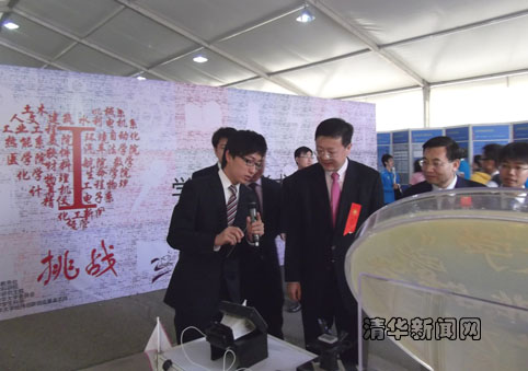 图为李子赫(左一)在第30届“挑战杯”学生课外学术科技作品展览上向校长陈吉宁(左二)、校党委书记胡和平(右二)展示研究成果。