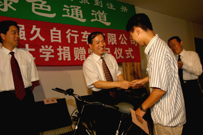 【新闻中心讯 记者 周襄楠 摄影 郭海军】8月18日上午,在迎新现场的绿色通道,2004级化学系新生聂晓琳从河北省强久自行车公司负责人手里接过簇新的银灰色的自行车,说:“社会上的爱心我们将永远铭记。”