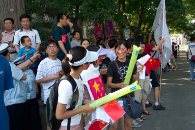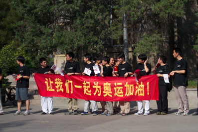 【新闻中心讯 学生记者 张尧立 摄影 邓卫】4点19分,当火炬手来到位于东西主干道的热能系馆前,热能系师生举着国旗和印有2008北京奥运的会徽的小旗,欢呼着。还有十几位同学举着“沐浴奥运清风,共谱体育华章”和“热情北京,无限潜能”的大纸牌,标语暗含“清华 热能”四个字。