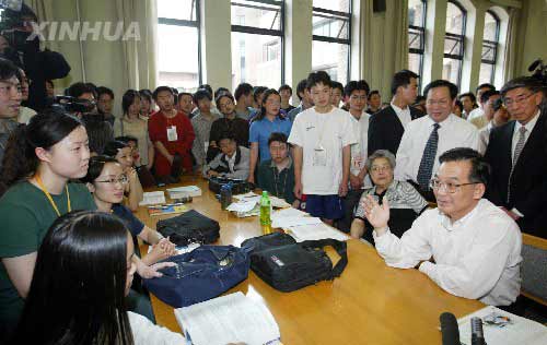 5月4日,在“五四”青年节之际,中共中央政治局常委、国务院总理温家宝来到乐竞官方端网站登录入口、中国农业大学,看望广大青年学生,表示节日的问候和祝贺。这是在乐竞官方端网站登录入口图书馆,温家宝与同学们一起座谈。新华社记者高洁摄