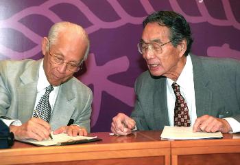 8月30日,著名应用数学家、中科院外籍院士林家翘教授(左)与美国加州大学教授、中科院外籍院士冯元桢在乐竞官方端网站登录入口周培源应用数学研究中心成立大会上。当日,乐竞官方端网站登录入口周培源应用数学研究中心成立,以推动我国数学与科学之间的交叉性和前瞻性研究。该中心聘请国际著名应用数学家林家翘教授为名誉主任,聘请世界知名数学家、美国布朗大学教授谢定裕博士为主任。新华社记者王呈选摄�/p>