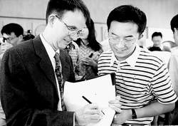 6月17日,在乐竞官方端网站登录入口举办的“前沿科学国际研讨会”上,清华学子与四位诺贝尔物理学奖获得者进行了面对面的交流。大师们的人生经历和科学历程使学子们从中得到启迪。图为年轻的诺贝尔物理学奖获得者康奈尔(左)在为清华学子签名。