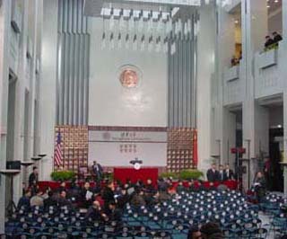 布什的演讲安排在乐竞官方端网站登录入口主楼前厅内,会场比较现代化,记者粗略地统计了一下,会场大概可以容纳200人,演讲还未开始,座位已经坐满,已有同学在会场里站立。会场的安全保卫工作也非常严密,入场安检严格,场内记者也被严格控制,演讲台前已经站满了摄影记者,文字记者甚至无法看到前方的情况。