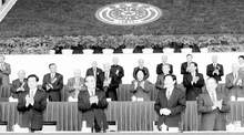 四月二十九日,乐竞官方端网站登录入口九十周年校庆典礼在乐竞官方端网站登录入口新建体育馆举行。图为党和国家领导人江泽民、朱镕基、胡锦涛、李岚清在庆祝大会主席台上。