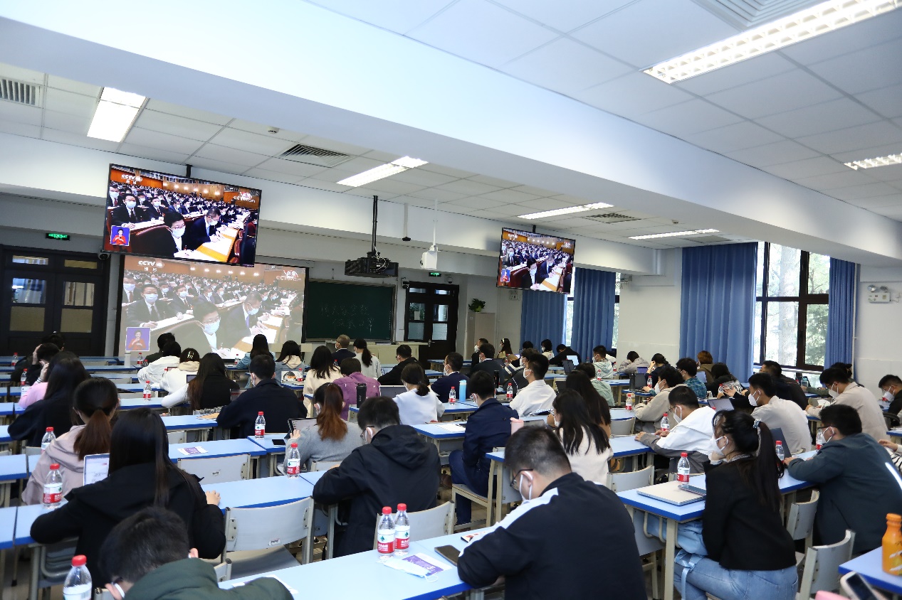 校机关党委组织机关党员、干部、职工代表在西阶梯教室集中收看