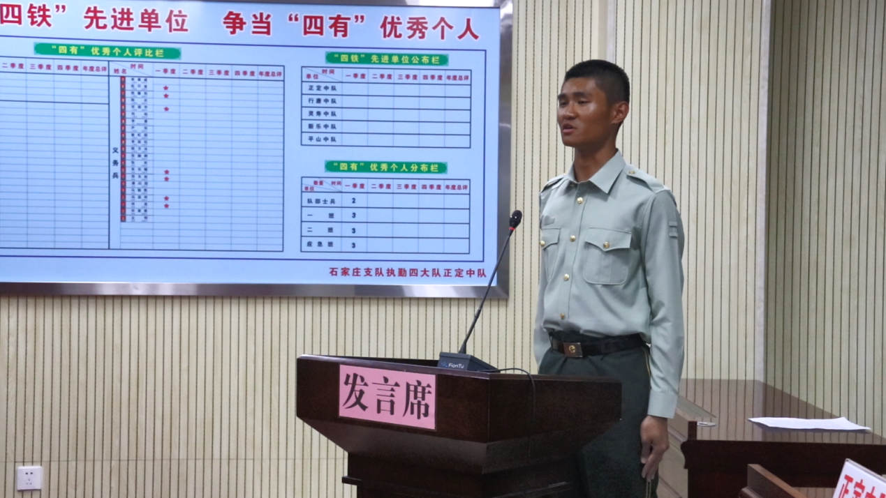 正定中队战士朱光耀介绍了正定中队的优良作风和光荣传统,并提到继承红色基因对于新时代军人的重要性。结合近期学习总书记重要讲话精神的心得体会,他表示作为一名武警战士,面前是穷凶极恶,背后是万家灯火,苦练本领不忘初心,保家卫国义无反顾。