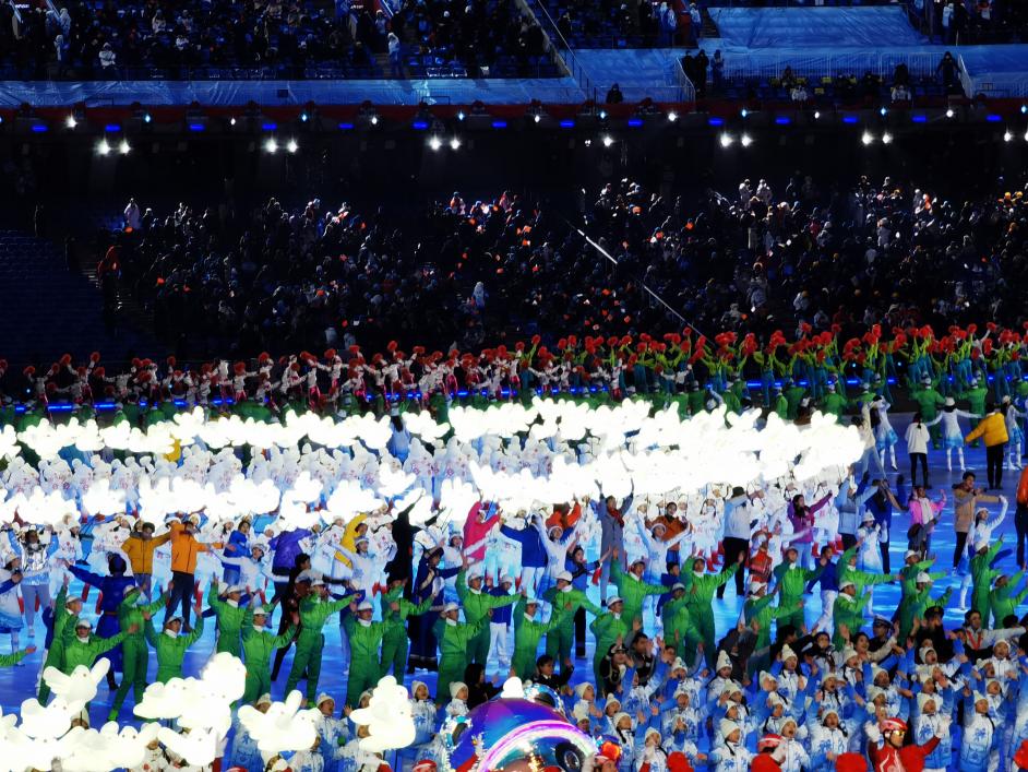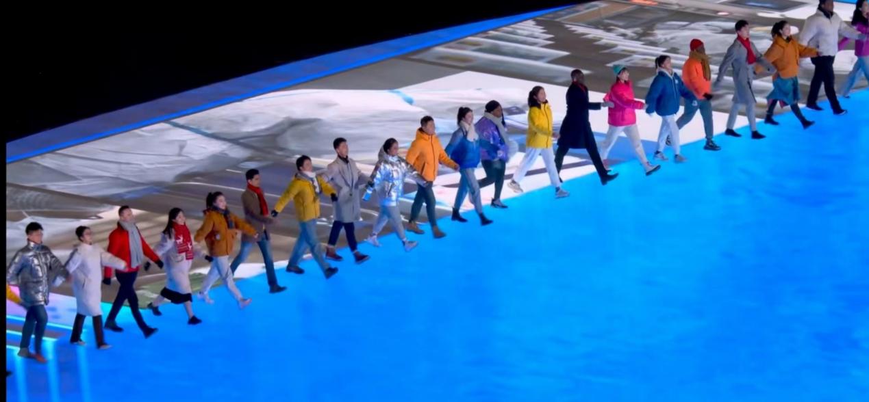 2022年2月4日北京冬奥会开幕式上,来自世界各地的76名青年人同向同行、并肩向前,一幅由各国人民照片组成的影像长卷在脚下缓缓展开。