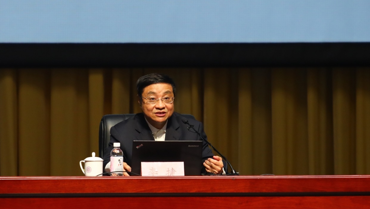李捷为中国新生作题为“从一个主题和四个阶段看百年党史的伟大成就、伟大创造、伟大梦想”的主题报告。李捷以对中国共产党历史展览馆的介绍入手,介绍了中国共产党百年征程中的伟大成就和伟大梦想,并对研究生新生提出希望。李捷对中国共产党在新民主主义革命时期、社会主义革命和建设时期、社会主义现代化建设新时期、中国特色社会主义新时代四个阶段的成就进行梳理,回顾了党在不同时期所面临的关键问题,深度解读了中国共产党为什么能、马克思主义为什么行、中国特色社会主义为什么好等问题。李捷期望新入学的研究生以中华大地为立足点,从具体实践出发认识历史,思考问题,奉献祖国,成长为国家的栋梁之才。