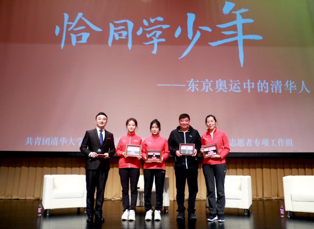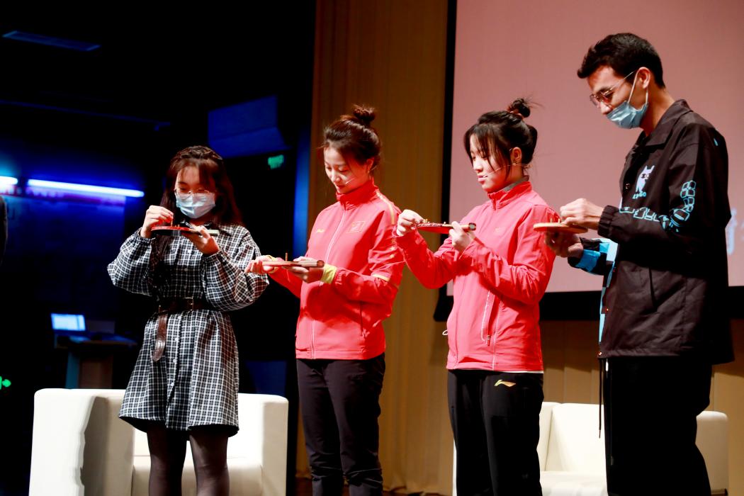 互动环节中,两名观众上台与杨倩、史梦瑶一起体验了射击稳定性测试,现场气氛轻松愉快,这是射击队测试运动员稳定性的经典方法,参与体验的观众们也感受到控制自身稳定性的不易。清华部分参与了全运会的体育代表队队员也来到了现场,并和大家进行了简单的交流和介绍。