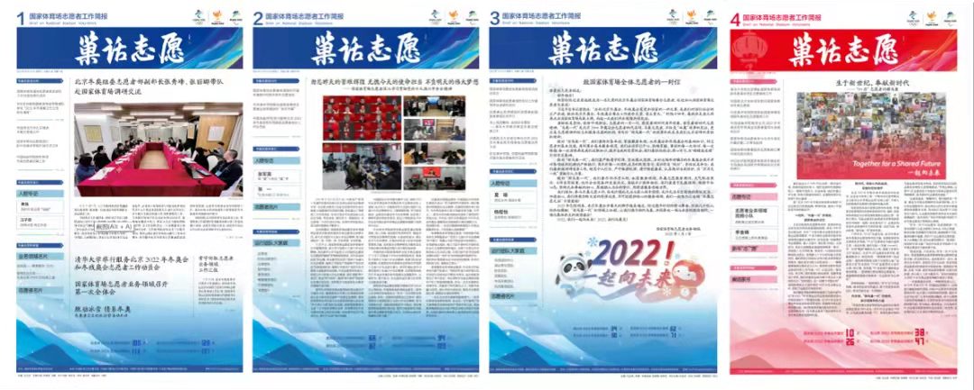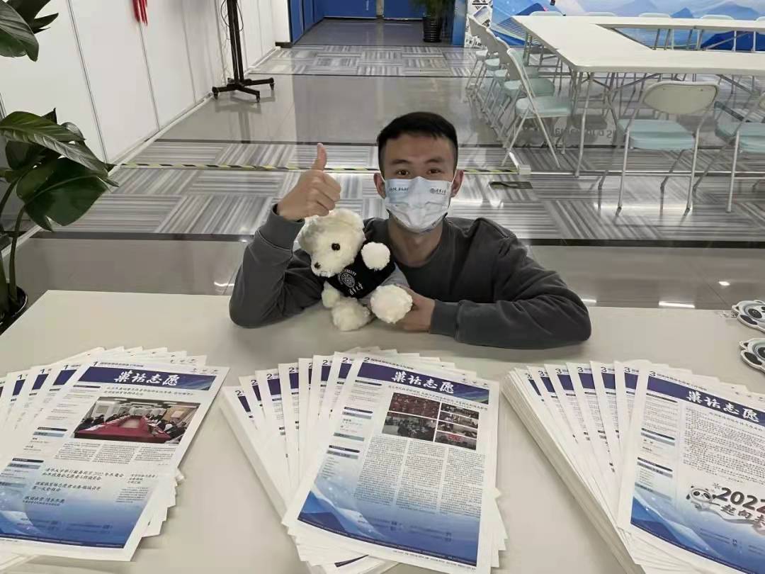 志愿者工作简报分为“冬巢志愿进行时”、“冬巢志愿风采汇”、“冬巢志愿早知道”等版面,详细介绍包括清华在内鸟巢志愿者来源高校的工作动态、人物访谈、志愿者名片等。为了做好这份报纸,宋志浩直言“压力山大”,简报小组主要与文字“较劲儿”,每期打磨稿件近5万字,编辑照片100余张,校订修改10余版······同学们从零开始接触排版设计、修改校审,一期期精美的《巢话志愿》,凝结着他们无数个日夜的心血。与此同时,宋志浩还牵头设计“巢语家书”“新春志愿”等栏目,在志愿者中营造“奥运年”氛围,邀请志愿者家属写信寄语、表达思念,与志愿者们一起品读亲情的温度,传递携手迎新春、一起向未来的美好祝愿。