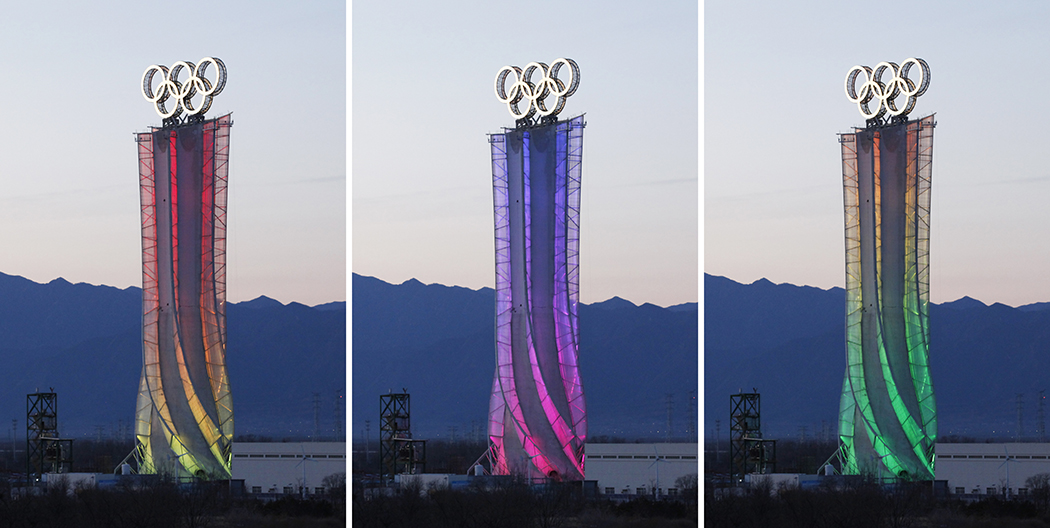 奥林匹克公园东端“双奥迎新”景观装置长13米、宽2.5米、高5米。