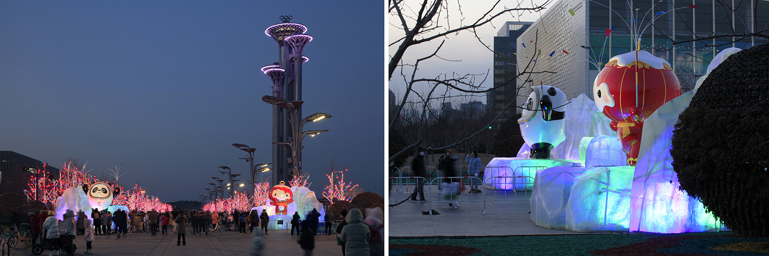 运用景观装置融合冬奥元素、春节元素、民俗元素,形成了多层次、多点位、多结构的冬奥春节景观联动体系。