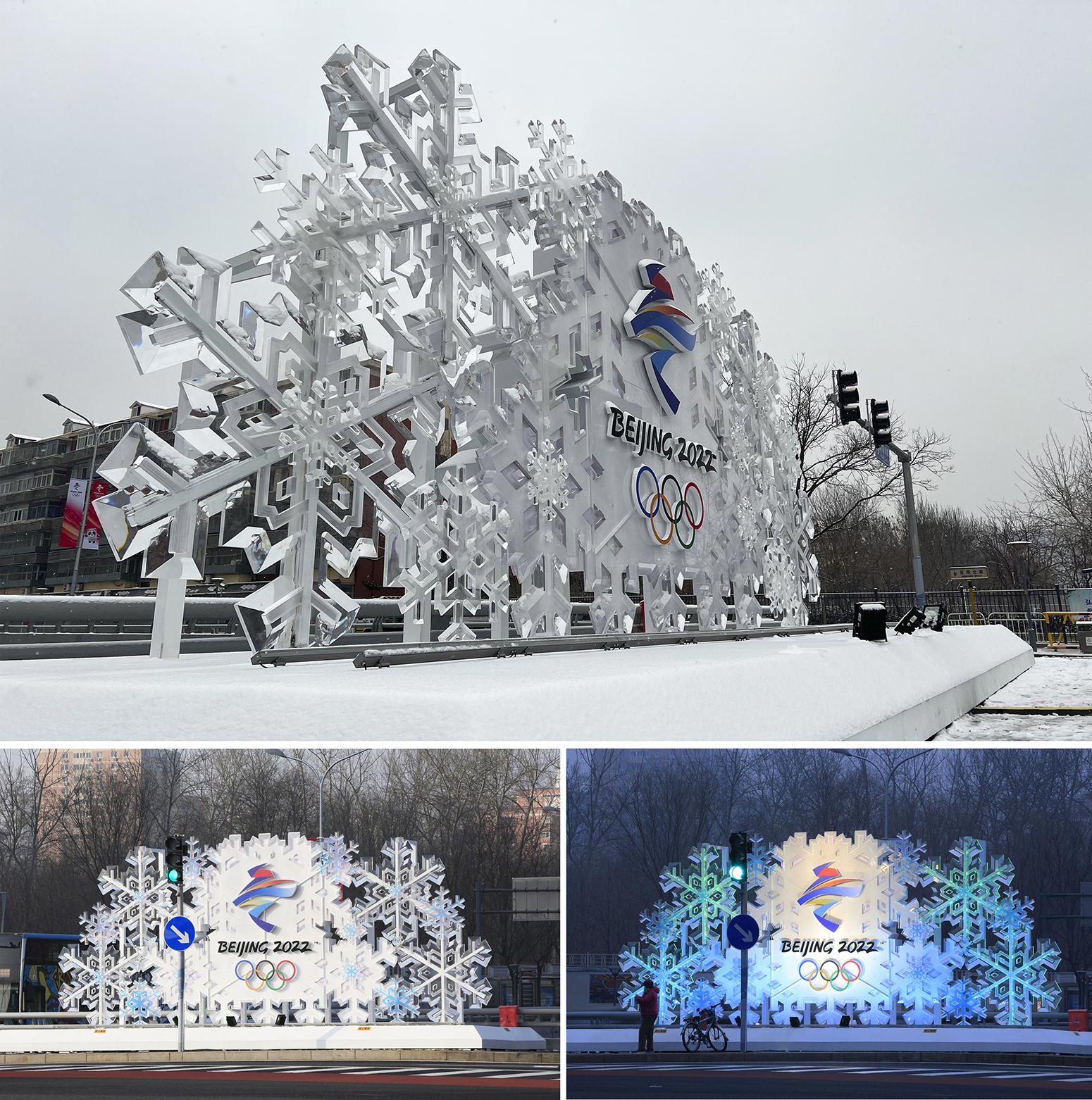 奥林匹克公园北端“喜迎冬奥”景观装置长6.8米、宽6.8米、高4米。