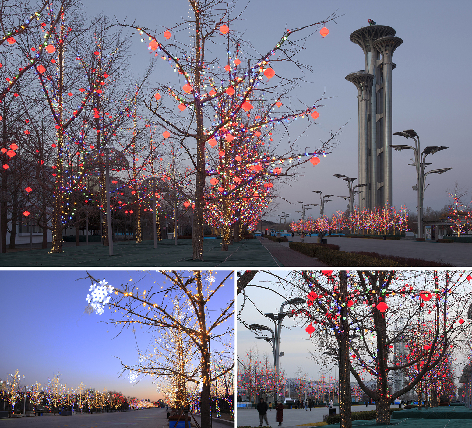 奥林匹克中心区南北中轴景观南段从民族园路至北四环,以雪花灯饰为主装点道路两侧树木,表现冬奥主题。
