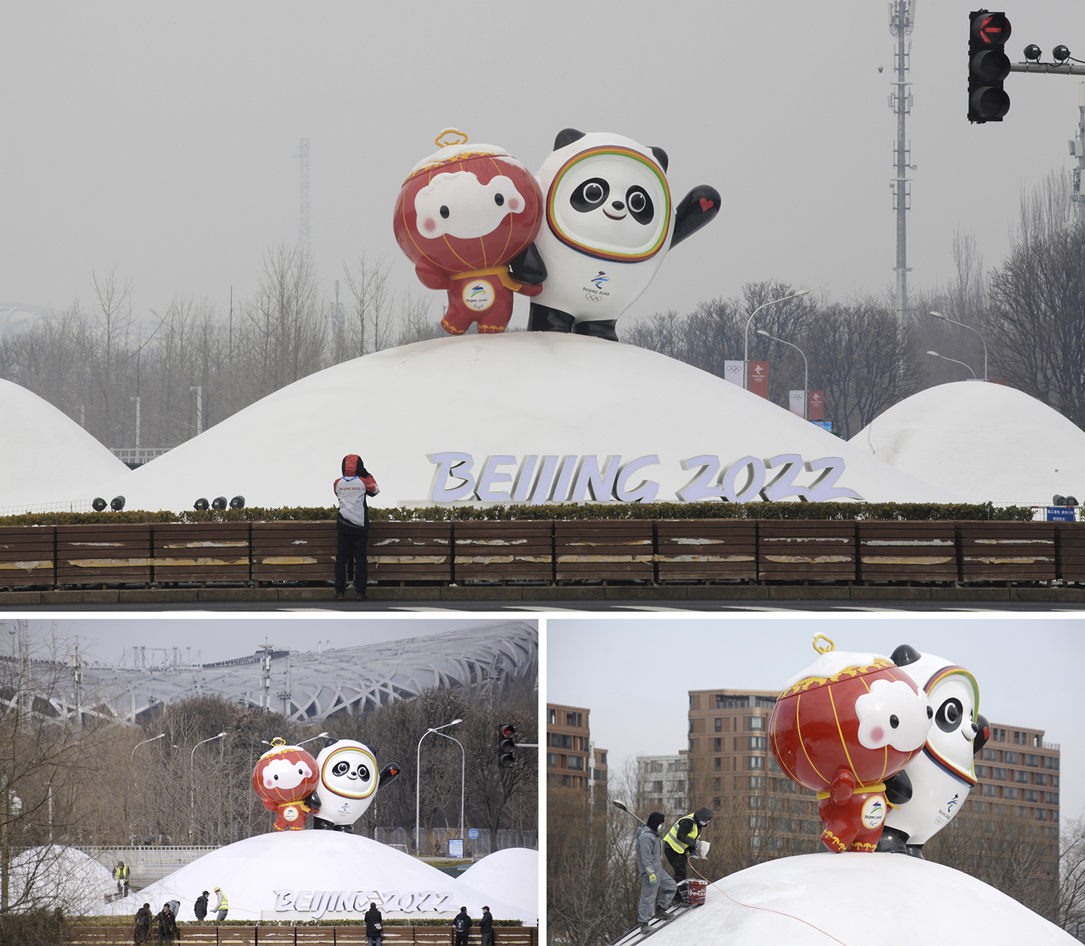 奥林匹克公园南端“冰雪之约”景观装置长29米、宽15米、高7.5米。基座以雪上运动基地为原型,冬奥会和冬残奥会吉祥物矗立其上。