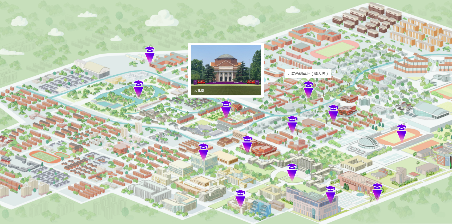 2022年6月,疫情形势出现反复,学校毕业典礼在“校园室外多会场+云上”基础上再次创新,十多年来首次安排在室外举行学位授予仪式。学校认真挑选学位授予仪式场地,精心布置紫色背板和红色地毯,打造一道道靓丽的校园风景线。