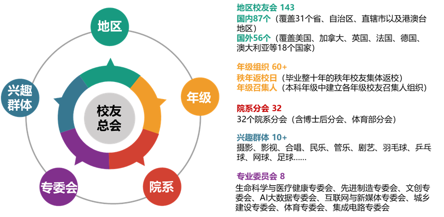 五年来,校友总会进一步加强制度建设,坚实稳固校友组织基础。不断完善地区、院系、年级、专委会和兴趣群体等五个维度的校友联络体系,联系和服务广大校友,目前有143个海内外校友会组织、32个院系分会、8个专业委员会和若干个校友兴趣群体。校友宣传体系推陈出新,打造“两刊一网三号”为主的全媒体宣传矩阵,弘扬清华精神,展示校友风采。信息化建设上新台阶,2019年6月上线校友数据库及管理应用系统,推出面向校友的移动端应用“清华人”微信小程序,支持校友身份认证及电子校友卡申领,提供不断完善的校友专属服务。2017年推出“清华校友终身学习支持计划”系列学习项目,服务校友不同层次的学习需求。2016年开始连续主办七届“清华校友创意创新创业大赛”(简称“三创大赛”),4400个校友项目通过大赛平台获得社会关注和资源支持,助力校友创新创业,服务校友职业发展,服务地方经济社会建设。