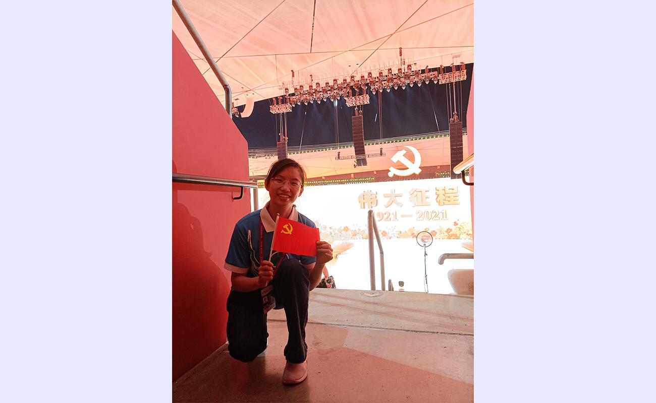 她仍然记得建党百年文艺晚会那天结束7个小时的服务后,所有清华志愿者站在鸟巢中央齐声呐喊:“百年接力,强国有我,请党放心!”