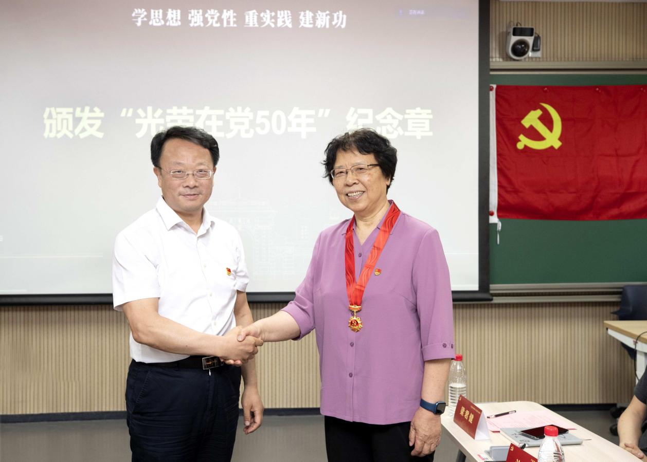 王希勤为新闻学院原党委书记王健华颁发“光荣在党50年”纪念章